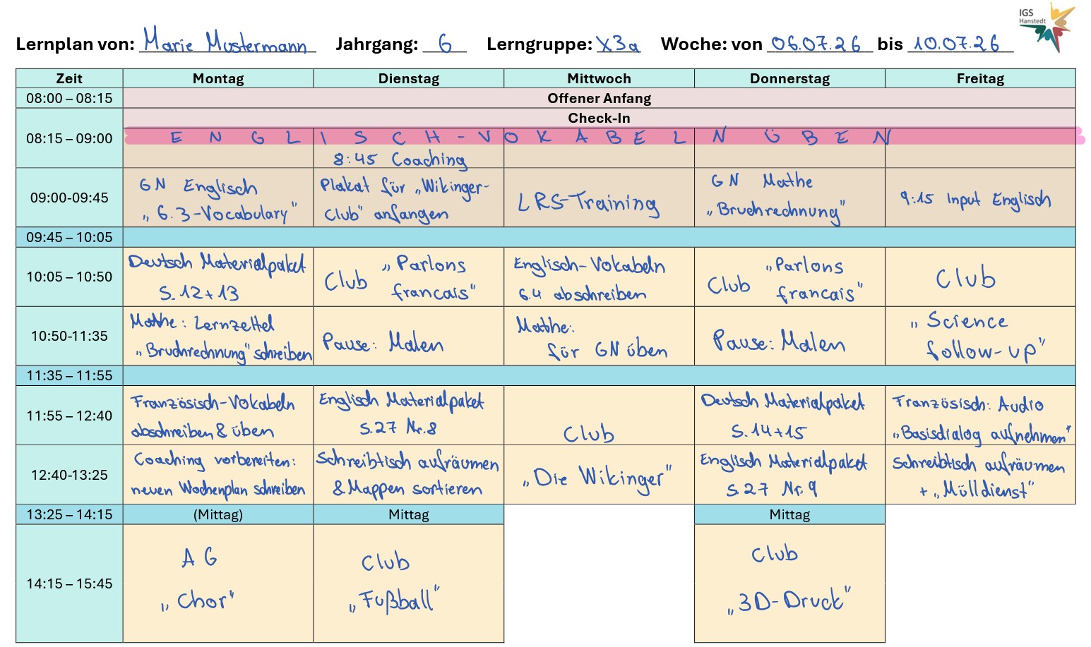 Gerade zu Beginn findet eine sehr enge Betreuung der Kinder durch die Lernbegleitung statt. Dabei geht es darum, den Kindern die Strukturen vorzugeben, die sie in der jeweiligen Situation brauchen, um effektiv arbeiten zu können. Die Kinder können in verschiedenen Räumen arbeiten: Lernbüros mit individualisierten Einzelarbeitsplätzen oder auf Marktplätzen mit Freunden. Langfristig sollen die Lernpartner:innen dazu befähigt werden, den Lernprozess selbstständig zu gestalten. Dabei unterstützen erfahrene Lernpartner:innen.